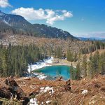 Ende Oktober 2018 sorgte das Sturmtief „Vaia“ in Südtirol für gewaltige Unwetterschäden. Über 1 Million Kubikmeter Wald sollen dabei den schweren Sturmböen zum Opfer gefallen sein. Das Eggental und das Gebiet um den Karersee gehören zu den besonders betroffenen Gebieten. Auch wenn die Sturmschäden mittlerweile zum Großteil behoben sind, wird es noch einige Zeit/Jahre dauern, bis die Hänge rund um den See wieder aufgeforstet sind. Trotzdem: Die Landschaft rund um den Karersee hat von ihrer Faszination nichts verloren und auch das typische Karersee-Foto mit dem Latemar im Hintergrund kann man noch problemlos machen, da dieses Waldstück zum Glück kaum zerstört wurde.