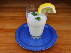 - Die Buttermilchmischung in ein Glas umfüllen, mit Pfefferminzblättern und einer Zitronenspalte dekorieren und sofort servieren.