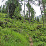 Man folgt weiter dem markierten Pfad, geht also nicht gerade aus auf die Mittagsspitze zu, sondern hält sich links (am großen Felsen vorbei). In einem großen Rechtsbogen folgt jetzt der Anstieg auf die Gipfelspitze. Der Pfad bleibt weiter recht schmal und führt stetig bergauf.
