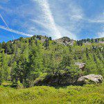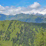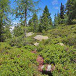 Der Weg ist von der Forststraße aus nicht unbedingt sofort erkennbar, aber nach etwas Suchen sieht man eine rot-weiße Markierung. Weiter geht es über einen schmalen Pfad bergauf. Schon bald lohnt sich übrigens ein Blick über die Schulter. Denn hinter dem Platschjoch, auf dessen Hang man zu Beginn der Wanderung geblickt hat, sind nun die mächtigen Gipfel der Stubaier Alpen zu sehen. Je höher man kommt, desto schöner wird das Bergpanorama. Außerdem hat man einen herrlichen Blick auf die Almenregion Ratschings-Jaufen (im Winter übrigens ein tolles Skigebiet).
