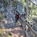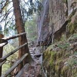 Ein kleiner Pfad, der stellenweise mit Geländer gesichert und mit Stufen leicht begehbar gemacht wurde, führt nun zum Oberen Wasserfall. Der Weg führt an mächtigen Felswändern vorbei und auch den Kopf muss man einmal einziehen. Eine seilversicherte Stelle gibt es auch, obwohl man die Seile eigentlich nicht braucht…