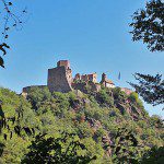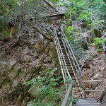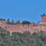 Kurz darauf führt der Weg jetzt ein ganzes Stück bergab und zwar in eine kleine Schlucht und zum Wieser Bach. Zunächst wandert man auf einem Pfad, dann erreicht man Treppen, die den Abstieg erleichtern. Diese sind zum Teil allerdings sehr steil. Kinder sollte man hier also besser an die Hand nehmen. Wer Höhenangst hat, wird an den Treppen vielleicht etwas Überwindung brauchen und diese eventuell lieber langsam rückwärts runtergehen. Danach geht es auf der anderen Seite ähnlich steil bergauf, dieses Mal allerdings ohne Treppen. Dieser Abschnitt ist der mit Abstand anstrengendste der gesamten Wanderung. Obwohl man hier wirklich nicht viele Höhenmeter überwinden muss, geht dieses Stück ordentlich in die Beine. Kleiner Trost: Man kann hin und wieder einen Blick auf Hocheppan erhaschen, die mächtige Burg kommt langsam näher. Auf Burg Hocheppan angekommen, hat man sich eine Rast in der schönen Burgschenke dann redlich verdient.