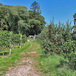 Nach etwa 5 Minuten biegt man links ab (ausgeschildert u.a. mit Schloss Boymont und Burgenweg) und folgt dem Weg in Richtung Wald. Rechts vom Weg befinden sich übrigens Apfelbäume, links vom Weg Weinreben. Wer hier im Spätsommer/Frühherbst unterwegs ist, kommt natürlich in Versuchung, hier einfach zuzugreifen, aber wie immer gilt: Angucken ist erlaubt, pflücken nicht!