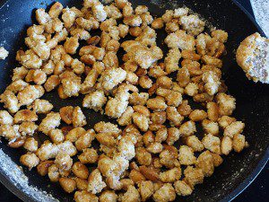 Tipp: Der übriggebliebene Zucker (jetzt zu Karamell erstarrt) bleibt recht hartnäckig an der Pfanne kleben. Es gibt jedoch einen Trick, wie man diese ganz einfach von der Pfanne löst: Etwas Wasser zu den Zuckerresten in der Pfanne geben, die Pfanne wieder auf den Herd stellen und alles einmal kurz warm/heiß werden lassen, bis sich der Zucker wieder auflöst. Nun kann man die Pfanne wie gewohnt reinigen.