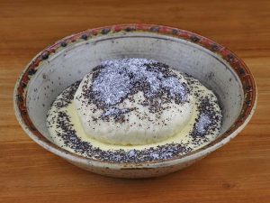 - In der Zwischenzeit den Puderzucker in eine Schüssel sieben, den gemahlenen Mohn dazugeben und gut miteinander vermischen.