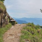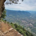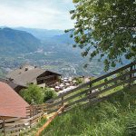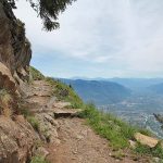Das letzte Stück auf dem Meraner Höhenweg geht es über Treppen und seilversicherte Stellen bergab. Dann erreicht man den Gasthof Steinegg (unterhalb des Gasthofs befindet sich eine Aussichtsplattform, von der man einen fantastischen Blick auf Meran, auf das Etschtal und die umliegenden Berge hat), kurz darauf den Hofschank Oberhochmut und den Gasthof Hochmuth, der direkt neben der Bergstation der Hochmuth-Seilbahn liegt.