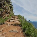 Der an manchen Stellen seilversicherte Steig ist durchgängig schmal bis sehr schmal. Links des Weges verläuft der Bergrücken, rechts des Weges geht es mehrere hundert Meter steil hinab ins Tal. Wer hier mit einem Hund unterwegs ist (eher nicht empfehlenswert!), sollte den Hund unbedingt anleinen und an die kurze Leine nehmen.