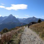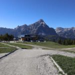 Am Gipfelkreuz vorbei wandert man nun geradeaus weiter in Richtung Osten. Man könnte hier gleich rechts steil über den Bergrücken absteigen, kniefreundlicher ist aber der kleine Umweg über die ehemalige Militärstraße. Wenige Minuten später biegt man rechts ab (Nr. 3, Nr. 20, „Hahnspielhütte“). Auf dem Karnischen Höhenweg, der herrliche Ausblicke auf die Sextner Dolomiten und die Sextner Sonnenuhr beschert, wandert man zu den Seilbahnen zurück. Unterwegs kommt man noch an der Hahnspielhütte und Olperls Bergwelt (Nähe der Bergstation, unter anderem gibt es hier eine Kinderalm und einen Barfußweg) vorbei.