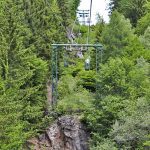 Der Korblift Vellau wurde speziell für Wanderer entwickelt und erinnert vom Aussehen ein wenig an einen Einkaufswagen. In den kleinen grünen Gondeln kann man bequem zu zweit hintereinander stehen (oder mit Kind auch zu dritt) und schwebt dann langsam über Wiesen und durch ein Waldstück hinauf auf die Leiter Alm.