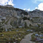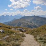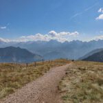 Zum Weiterwandern biegt man hinter der Plattform rechts ab (Nr. 22, „Passo Feudo“ und Themenweg „Latemar.Panorama“). Der Weg führt kurz durch den Wald, dann ist man an den aussichtsreichen Hängen des Latemar unterwegs und bekommt dabei einen großartigen Blick auf die umliegenden Berge. Links neben dem Weg liegt der Latemar, rechts zeigen sich Weißhorn, Schwarzhorn und Zanggen von ihrer schönsten Seite.