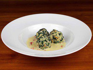 Mangoldknödel auf Tomaten-Käse-Sauce