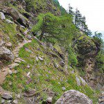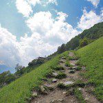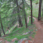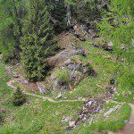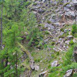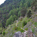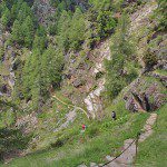 Der Weg führt jetzt am Hang entlang, vorbei an grünen Almwiesen und mit herrlichen Ausblicken auf den Vinschgau. So langsam nähert man sich auch der 1000-Stufen-Schlucht. Schilder längs der Wegen geben interessante Details über die Schlucht preis. Laut den Schildern sind es übrigens nur 987 Stufen und nicht 1000 (wir haben nicht mitgezählt). Insgesamt ist die Strecke, die man in den Lahnbachgraben hinab und auf der anderen Seite hinaufsteigt, etwa 1,5 Kilometer lang.