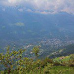 Vom Weg aus hat man auch immer wieder wunderbare Ausblicke ins Vinschgauer Tal. Man kommt am Bauernhof Hochforch vorbei, kurz danach könnte man nach Naturns absteigen. Wir bleiben aber auf dem leicht rechts weggehenden, bergauf führenden Weg und folgen weiter der Ausschilderung Meraner Höhenweg.