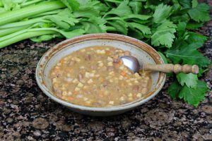 - Das Olivenöl in einem Topf erhitzen. In der Zwischenzeit den Knoblauch, die Karotte, die Selleriestange und den Salbei klein hacken und im heißen Olivenöl bei mittlerer Hitze 3 bis 4 Minuten andünsten. Für einen kräftigeren Geschmack kann man hier auch ein wenig feingewürfelten Bauchspeck mit andünsten.