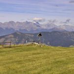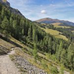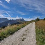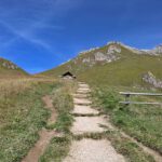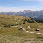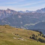 Genau zur richtigen Zeit kommt man an der nächsten Einkehrmöglichkeit vorbei, der Ütia Vaciara. Man bleibt weiter auf dem Almenweg und biegen bei einer kleinen Almhütte links auf einen Steig ab (Nr. 35, „Göma“). Ohne nennenswerten Höhenunterschied, dafür aber mit einer sensationellen Aussicht, wandert man die wenigen Meter zum Gömajoch hinauf. Eine Infotafel zeigt, welche Gipfel und Bergmassive man von hier aus sehen kann.