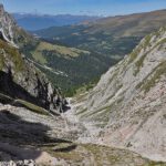 Von der Peitlerscharte geht es über schöne Almwiesen steil bergab (Nr. 4B, „Campill“). Das Dolomitenpanorama ist atemberaubend. Man sieht unter anderem die Kreuzkofelgruppe und die Civetta, außerdem liegt einem das Gadertal zu Füßen. Man wandert jetzt an der Südseite des Peitlerkofels entlang und kann feststellen, dass der Berg von dieser Seite sehr viel harmloser aussieht als vom Würzjoch.