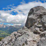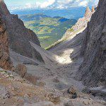 Wer lieber sofort mit dem Wandern beginnen möchte, geht von der Bergstation aus ein paar Meter weiter geradeaus und nimmt dann den Abstieg durch die Langkofelscharte in Angriff. Der Schnee hält sich in der Scharte teilweise recht hartnäckig, so dass man, wenn man die Wanderung bereits im Frühsommer machen möchte, durchaus noch mit größeren Schneefeldern rechnen muss.