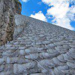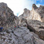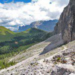 Nun geht es in vielen Kehren, über Geröll und Stein durch die Langkofelscharte zum Teil recht steil bergab. Die gewaltige Scharte liegt genau zwischen Langkofel und Plattkofel, so dass man hier wirklich grandiose Ausblicke auf die mächtige Felswände, die rechts und links des Weges liegen, hat.