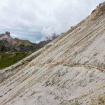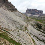 Nach der Hütte geht es nun in rund einer dreiviertel Stunden im stetem auf und ab wieder zum Ausgangspunkt, der Auronzo-Hütte, zurück, wobei die bergauf führenden Abschnitte überwiegen. Gerade zum Ende hin gibt es dann auch ein paar ausgesetzte Stellen, die Schwindelfreiheit und Trittsicherheit voraussetzen. An manchen Stellen kann man noch Überbleibsel alter Seilversicherungen erkennen. Diese braucht man heute aber nicht mehr, da der Weg deutlich verbreitert und besonders ausgesetzte Stellen dadurch entschärft wurden.