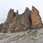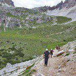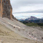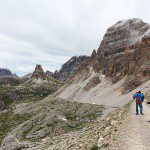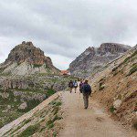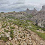 Je nachdem, ob man oberhalb oder unterhalb der Auronzo-Hütte einen Parkplatz bekommen hat, muss man nun entweder ein Stück zum Wanderweg hoch- und hinuntergehen. Unsere Wanderkarte startet an der Bushaltestelle. Der Wanderweg führt zunächst rechts an den Südwänden der Drei Zinnen entlang. Wie beliebt diese Wanderung ist, zeigt sich alleine daran, dass man sich selbst bei schlechterem Wetter beim Wandern mehr oder weniger in einer Karawane vorwärts bewegt. Wer hier etwas mehr Ruhe haben möchte, muss für die Wanderung also sehr früh aufstehen.