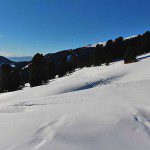Jetzt kann man sich im Prinzip seinen Weg ein wenig selbst suchen. Rechts befindet sich der mächtige Peitlerkofel, links oben befindet sich die Fahrstraße mit den Langlauf-Loipen, die dann wieder zurück zum Würzjoch führt. Entweder bleibt man in den Spuren der anderen Wanderer oder zieht seine eigene Spur durch den Schnee. Verlaufen kann man sich hier nicht, denn letztendlich muss man den Hang, den man vorhin nach unten gegangen ist, erneut queren, um wieder zurück zu der Fahrstraße und damit zum Würzjoch zu kommen. An welcher Stelle man den Hang quert, ist dabei eigentlich egal, denn dank der Schneeschuhe ist das Wandern durch Tiefschnee kein Problem.
