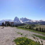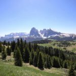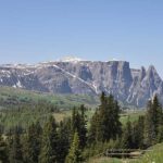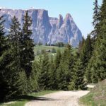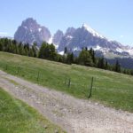 Mit der Seiser-Alm-Umlaufbahn geht es zunächst ganz entspannt von St. Ulrich hinauf die Seiser Alm. Hier lädt gleich der Gasthof Monte Seuc mit seiner riesigen Sonnenterrasse zum Verweilen ein. Wer sich die Rast jedoch erst einmal verdienen will, bleibt standhaft und nimmt Weg Nummer 9, der durch Wiesen und kleine Waldstücke in Richtung der Jausenstation Schgaguler führt. Nun geht es auf dem gut ausgebauten Weg Nummer 9 immer weiter hinab, bis man Saltria erreicht, den tiefsten Punkt dieser Wanderung. Die Ausblicke aufs Sellamassiv, auf den Langkofel, Plattkofel, Schlern, die Rosszähne und viele weitere Dolomitenberge sind einfach überragend, der perfekte Ort für einen längeren Fotostopp.