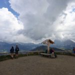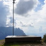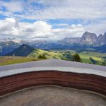 Etwa 20 Minuten später biegt man, kurz vor dem Bergrestaurant, links ab (Nr. 14A) und steht wenig später vor der Aussichtsplattform Engelrast. Der Ausblick auf die Dolomiten und die Seiser Alm ist grandios. Das die Plattform umlaufende Metallband gibt Aufschluss darüber, welche Berge man sehen kann. Ein nettes Detail dieser Plattform ist der kleine Engel, der über diesem Aussichtspunkt schwebt.