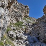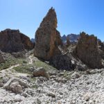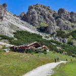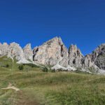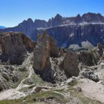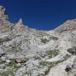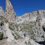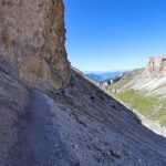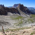 Hinter der Jimmi-Hütte folgt man dem steinigen Steig, der in kleinen Serpentinen steil nach oben führt. Wie schnell man an Höhe gewinnt, zeigt ein Blick über die Schulter: Jimmi-Hütte, Langkofel, Sellastock und das Grödner Joch sehen schon nach wenigen Minuten wie eine Miniaturlandschaft aus. Bald wird die Steigung wieder etwas gemütlicher, sodass man sich voll und ganz auf das grandiose Bergpanorama konzentrieren kann.