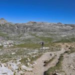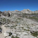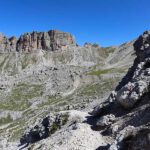 Wer zurück zum Cirjoch blickt, kann rechts davon den Schlern und Teile der Seiser Alm sehen. Am Crespeina Joch geht es geradeaus weiter (Nr. 2, „Puez-Hütte“), der felsige Weg führt jetzt ein ordentliches Stück bergab. Es dauert nicht lange, dann kann man vor sich, in einer Senke, den Crespeina See liegen sehen. Bis wir man die Senke erreicht, dauert es aber noch eine knappe