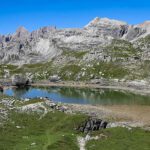 Nun ist ein wenig Orientierung gefragt. Kurz bevor der Weg wieder bergauf (in Richtung Puezhütte) führen würde, biegt man links ab und folgt dem gut sichtbaren Trampelpfad. Vom See oder einem Hinweisschild ist an dieser Stelle nichts zu sehen. Wenig später steht man dann auch schon vor dem Crespeina See (2370 m). Der Crespeina See hat eine Fläche von maximal 160 x 70 Metern, im (trockenen) Sommer kann er aber deutlich kleiner sein.