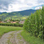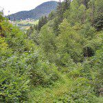 Wenig später verlässt man den Wald, überquert einen kleinen Bach, folgt dem durch Wiesen führenden Feldweg und erreicht wenig später wieder Gufidaun.