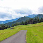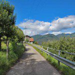 Im Wald geht es jetzt etwa 20 Minuten größtenteils bergauf, danach erreicht man wieder den Waldrand und wandert über grüne Almwiesen. Am Waldrand kommt man erneut an eine Verzweigung und geht geradeaus weiter. Kurz darauf kommt man an Bauernhöfen vorbei und stößt auf eine asphaltierte Straße. Dieser Straße, die sich leicht bergab durch Wiesen schlängelt, folgt man und blickt dabei direkt auf die Plose.