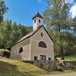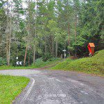 Am Ende der Straße biegt man links ab und wandert auf der bergab führenden Fahrstraße weiter. Bei Kehre 1 und dem Rotkreuz verlässt man die Fahrstraße und folgt dem in den Wald hinein führenden Weg, biegt also rechts ab.
