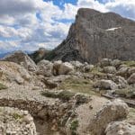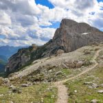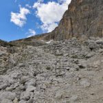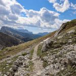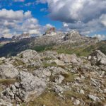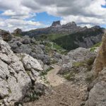 Die nächste Viertelstunde geht es auf einem gerölligen Steig unterhalb der mächtigen Lagazuoi-Felswände stetig bergauf. Egal, wohin man auch schaut: Das Panorama ist grandios! Kein Wunder, denn bekannte Dolomitenmassive wie die Tofane oder die Fanesgruppe zeigen sich hier von ihrer schönsten Seite. Links sieht man den Hexenstein als ständigen Wegbegleiter. In einem Geröllfeld hält man sich leicht links. Manchmal braucht man bei diesem Weg auch ein wenig Orientierungssinn – im Prinzip geht es aber immer geradeaus.
