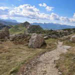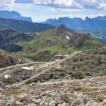 Man kommt an alten Schützengräben vorbei und hält sich bei zwei großen Felsen rechts. Etwa 5 Minuten später wandert man an einer Wegteilung links weiter („Forte Tre Sassi“). Man bleibt weiter auf dem dem Steig, genießt den atemberaubenden Blick auf die Dolomiten und wandert nun, sich eher links haltend, in deutlichem Bergab zurück zum Ausgangspunkt.