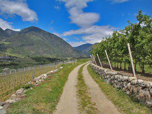 Links Weinreben, rechts Apfelbäume