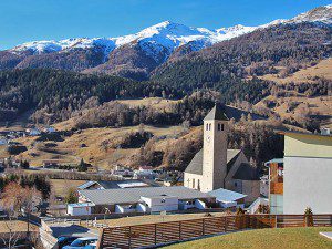 Blick auf die Pfarrkirche von Reschen