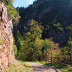 Der ganz leicht ansteigende Weg führt an einer Wand aus rotem Porphyrgestein vorbei (ein Schild weist auf möglichen Steinschlag hin) und gibt den Blick auf den Fragsburger Wasserfall frei. Die Wassermassen stürzen über eine riesige Felswand hinab in eine kleine Schlucht. Wenige Meter später ist der Weg dann leider auch schon zu Ende. Direkt zum Wasserfall kommt man leider nicht, der Weg ist gesperrt. Aber zumindest kann man von der kleinen Aussichtsplattform gut den Fragsburger Wasserfall und die davor befindliche kleine Hängebrücke erkennen. Die kleine Hinweistafel am Aussichtspunkt informiert übrigens darüber, dass es sich beim Fragsburger Wasserfall um den Wasserfall des Sinichbaches handelt. Aber normalerweise bezeichnen auch die Einheimischen den Wasserfall als Fragsburger Wasserfall.