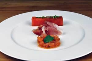 Raffinierte Südtiroler Küche: Bei diesem leichten Sommergericht wird Südtiroler Speck zusammen mit Wassermelone und geschmolzenen Tomaten serviert.