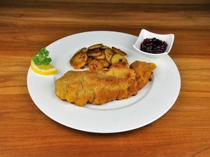 - Das fertige Schnitzel mit einem Pfannenwender vorsichtig aus der Pfanne heben, auf einem Küchenpapier kurz abtropfen lassen und am besten sofort – mit einer Zitronenscheibe und ein wenig Preiselbeerkompott – servieren.